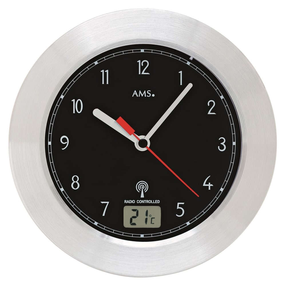 • Klok 5919 is een waterdichte badkamerklok met een aluminium rand, digitale temperatuurweergave en een mineraalglas voor de zwarte wijzerplaat.
