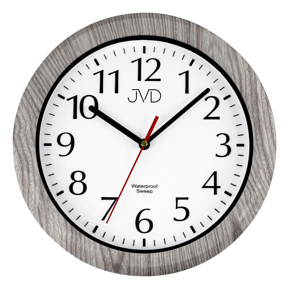 • Klok SH494-3J is een waterdichte badkamerklok van kunststof met een grijs hout motief rand en zwarte binnenrand.