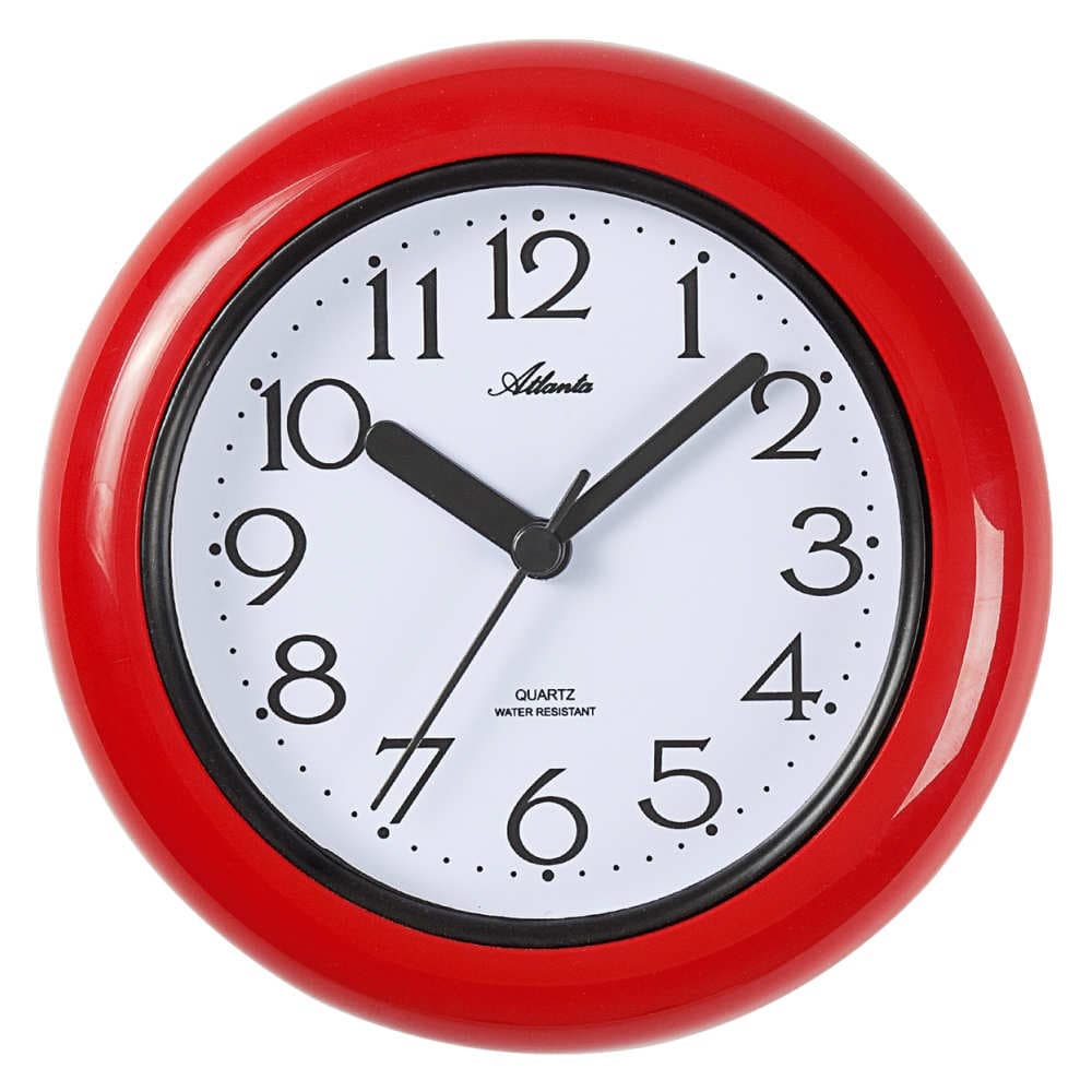 • Klok 454-1A is een waterdichte badkamerklok in een rode kunststof uitvoering met zwarte binnenrand, witte wijzerplaat met zwarte opgedrukte cijfers en zwarte wijzers.