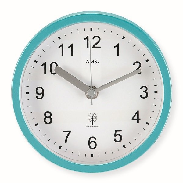 • Klok 5921 is een waterdichte badkamerklok met een turquoise gekleurde kunststof rand en een mineraalglas voor de wijzerplaat.