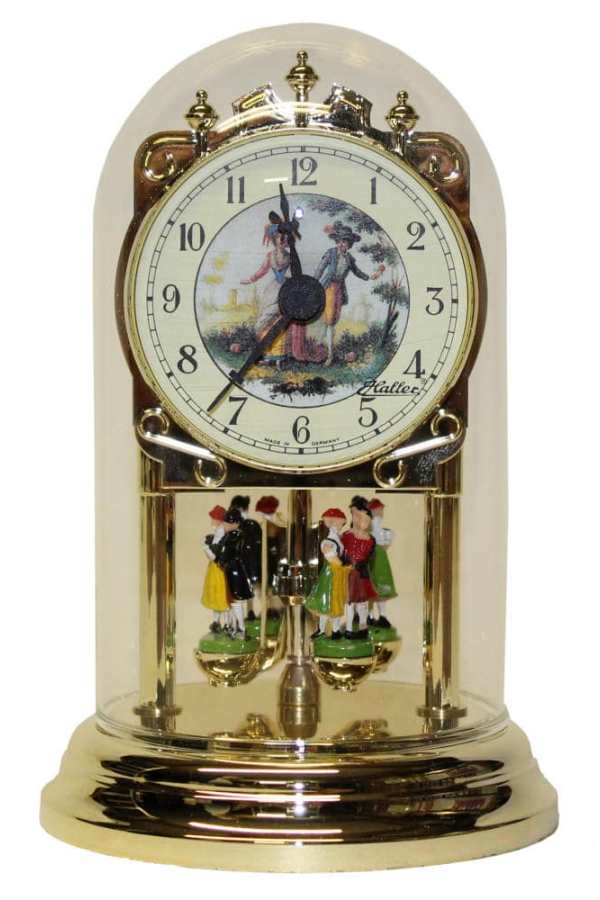 • Klok 173-007-530H is een jaarpendule stolpklok in een messing gekleurde uitvoering met een glazen stolp en kunststof Schwarzwald figuren.