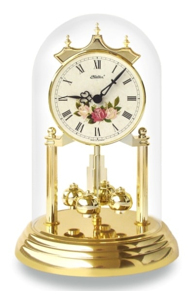 • Klok 121-378H is een jaarpendule stolpklok in een messing gekleurde uitvoering met een glazen stolp, op de wijzerplaat is een rozen motief afgebeeld.