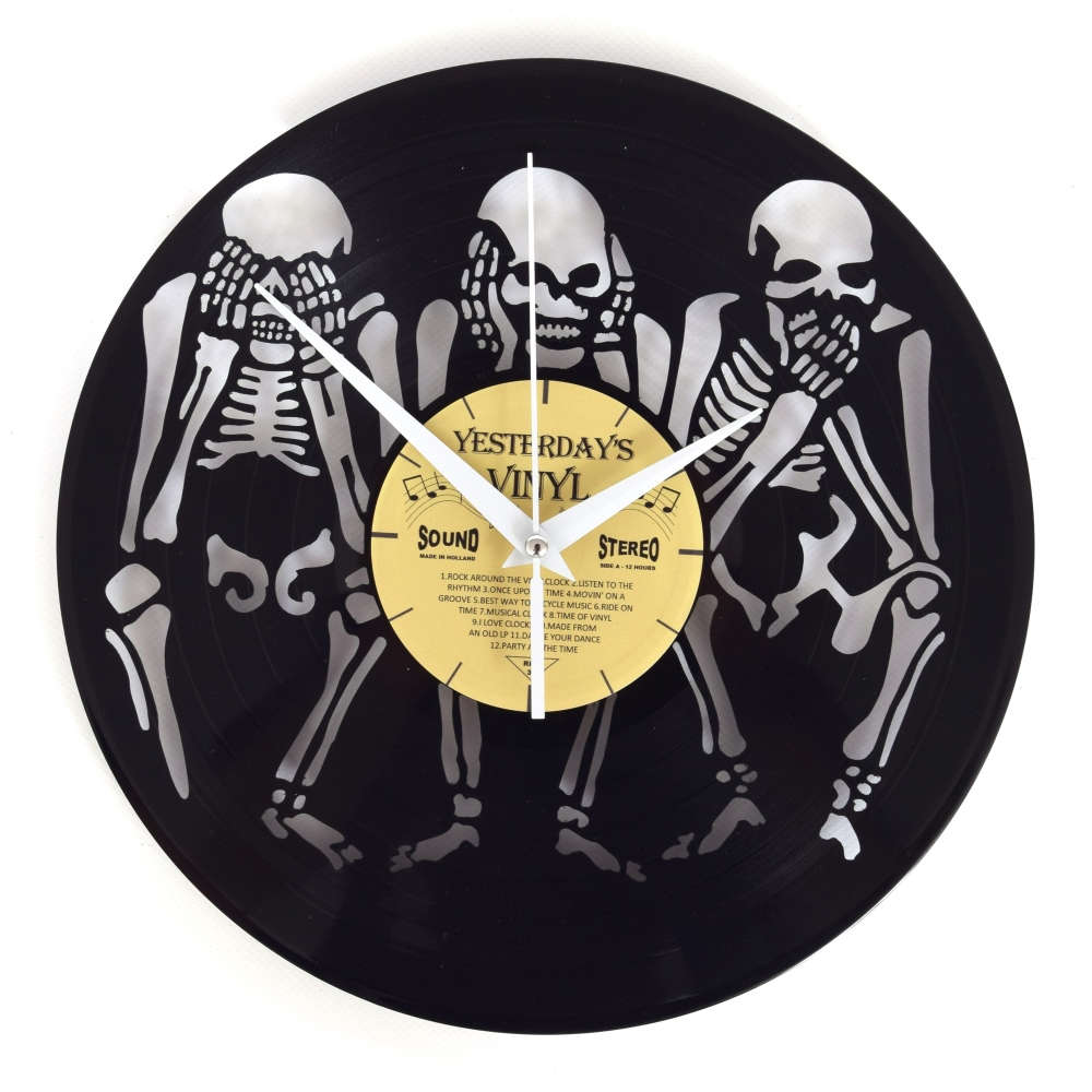 Klok 601-3255 is een LP klok met uniek uitgefreesd horen zien zwijgen design. De alom bekende uitdrukking horen, zien en zwijgen zou eigenlijk niet horen, niet zien en niet zwijgen moeten zijn. De skeletten op deze LP wandklok staan immers afgebeeld met handen over oren, ogen en mond. Deze houding wil zoveel zeggen als zie, hoor en spreek geen kwaad. Oftewel, het is soms best verstandig om niet altijd alles publiek te maken! Het is een eeuwenoude wijsheid overgewaaid uit het Verre Oosten. Ooit bedacht door de Chinese filosoof Confucius en daarna omarmd door boeddhisten. Veel verzamelaars hebben vast en zeker het welbekende beeldje met de drie zwijgende apen in hun collectie. Deze skelet-versie in de vorm van een LP wandklok is voor de verzamelaar een niet te missen item.