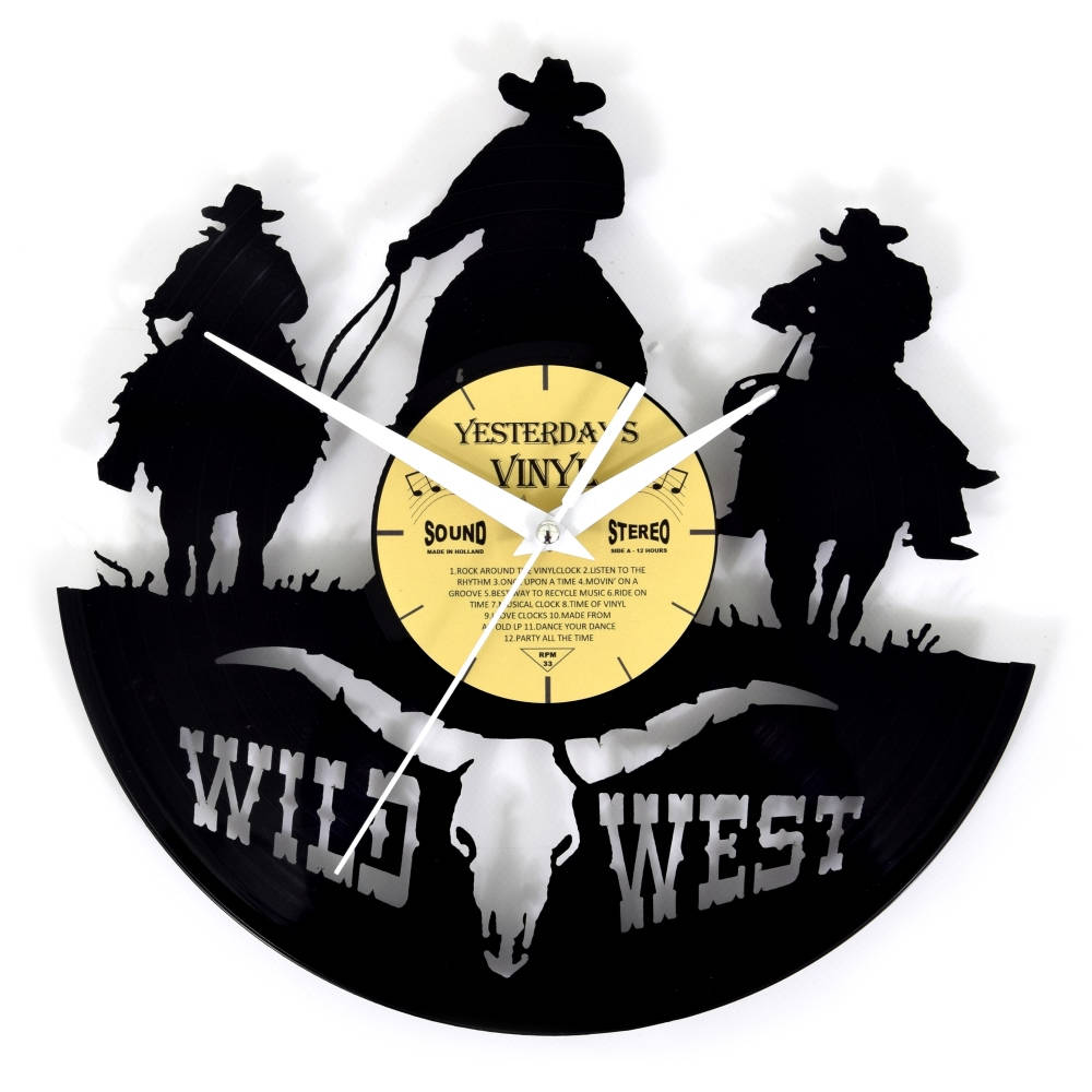 Klok 601-3231 is een LP klok met uniek uitgefreesd Wild West design met 3 cowboys te paard. Dit leuke herkenbare tafereel haalt de mooiste herinneringen naar boven naar de prachtige cowboyfilms en boeken met spannende verhalen. Voor iedere fan van het Wilde Westen is deze stoere klok een prachtige aanvulling in het interieur en daarnaast ook nog erg functioneel.