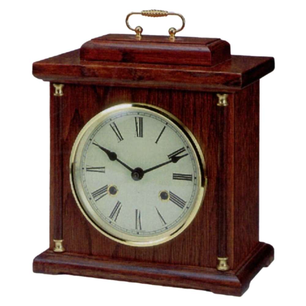 • Klok 120-260 is een tafelklok in een donker eikenhouten uitvoering met een gebold mineraalglas, messing beugel, sierdelen en rand om de wijzerplaat.