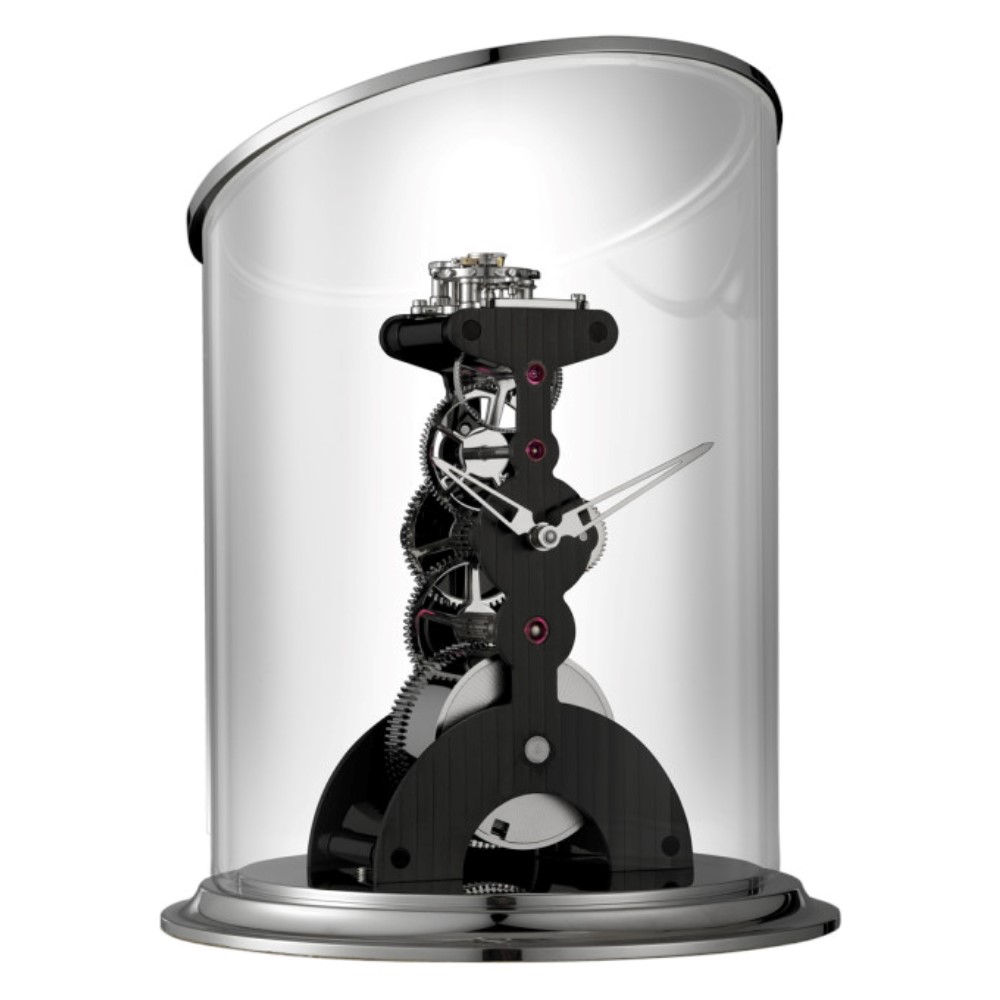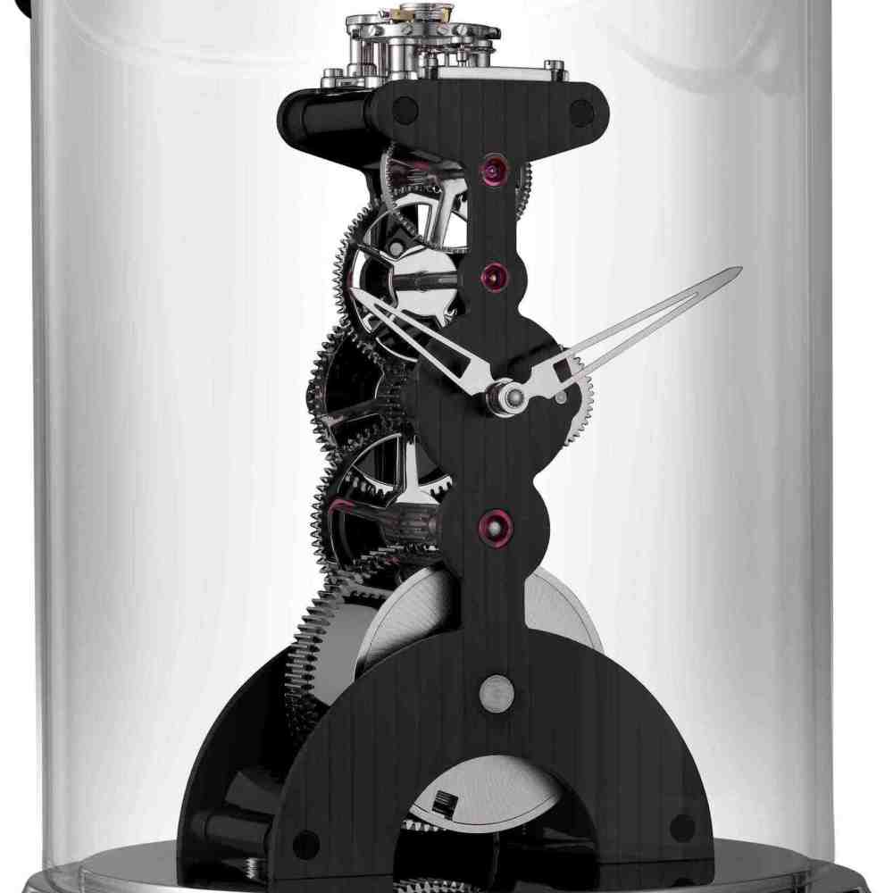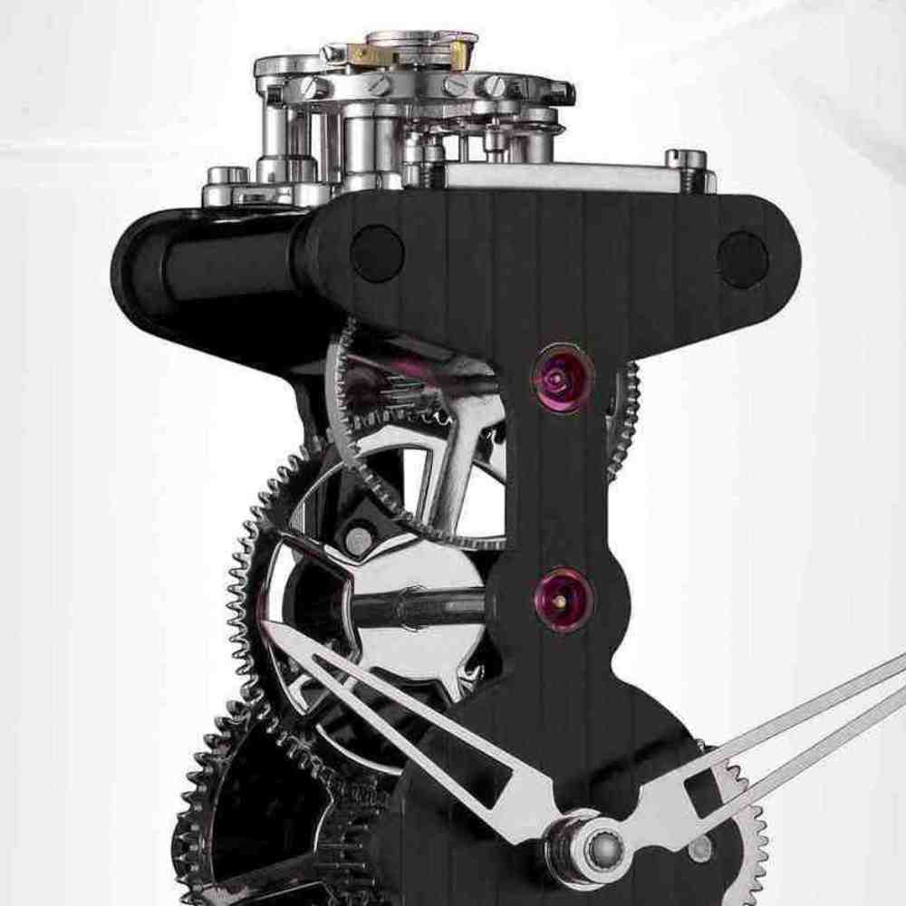 - Swiss made 8-daags 18 steens mechanisch skeletuurwerk met een zwarte coating en palladium gecoate raderen.