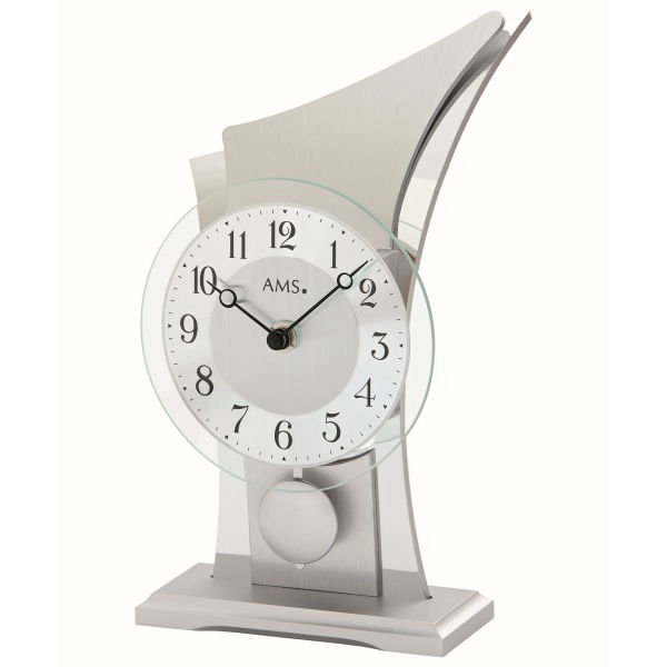 • Klok 1138 is een pendule tafelklok in een glanzend en gematteerde aluminium gekleurde gebogen uitvoering met mineraalglas en een aluminium wijzerplaat.