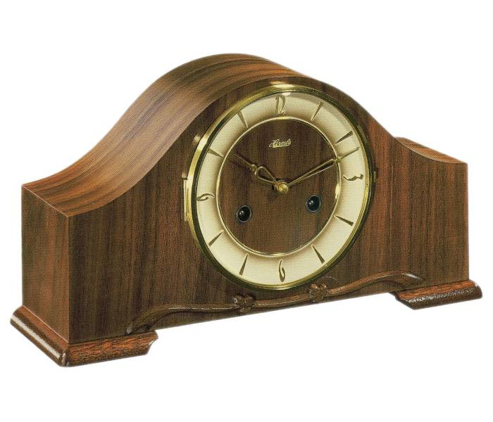 • Klok 21042-420150 is een tafelklok in een donker eikenhouten uitvoering met houten sierlijst aan de voorkant.