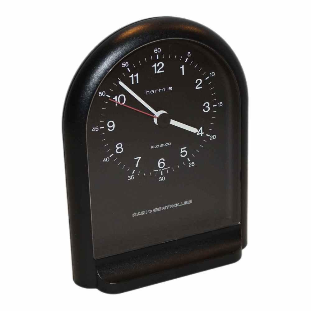 • Klok 22561-000800 is een tafelklok met een mat zwarte kunststof behuizing en een plexiglas voor de zwarte wijzerplaat met witte opgedrukte cijfers.