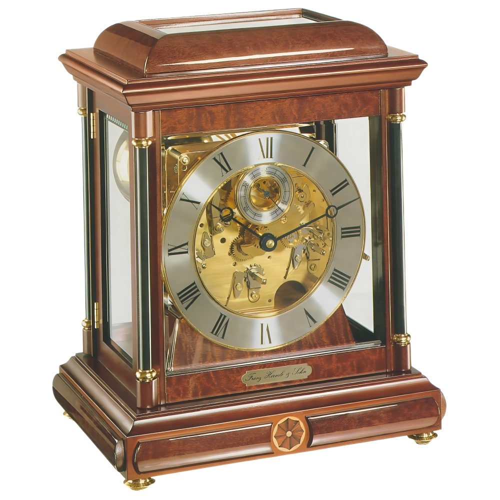 • Klok 22731-070352 is een luxe tafelklok van massief mahoniehout met wortelhouten delen en ingelegd houten sierelement.