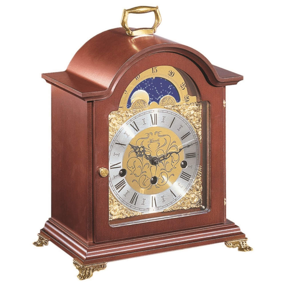 • Klok 22830-N90340 is een tafelklok van massief hout in een Amerikaans kersen kleur gelakt met messing sierpootjes en beugel.