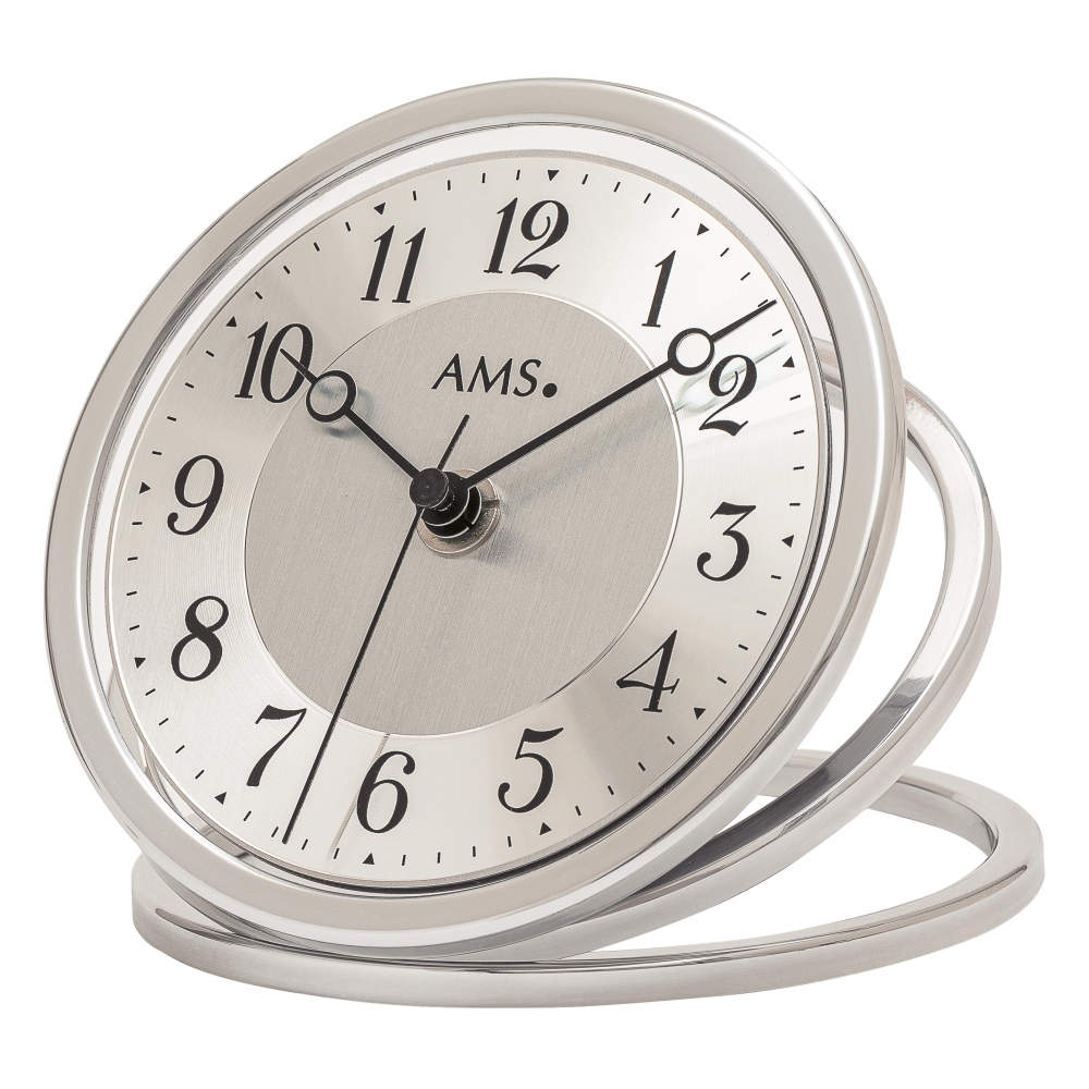 • Klok 5178 is een tafelklok in een zilverkleurige metalen uitvoering met een matte aluminium wijzerplaat en cijferrand bedrukt met zwarte cijfers.