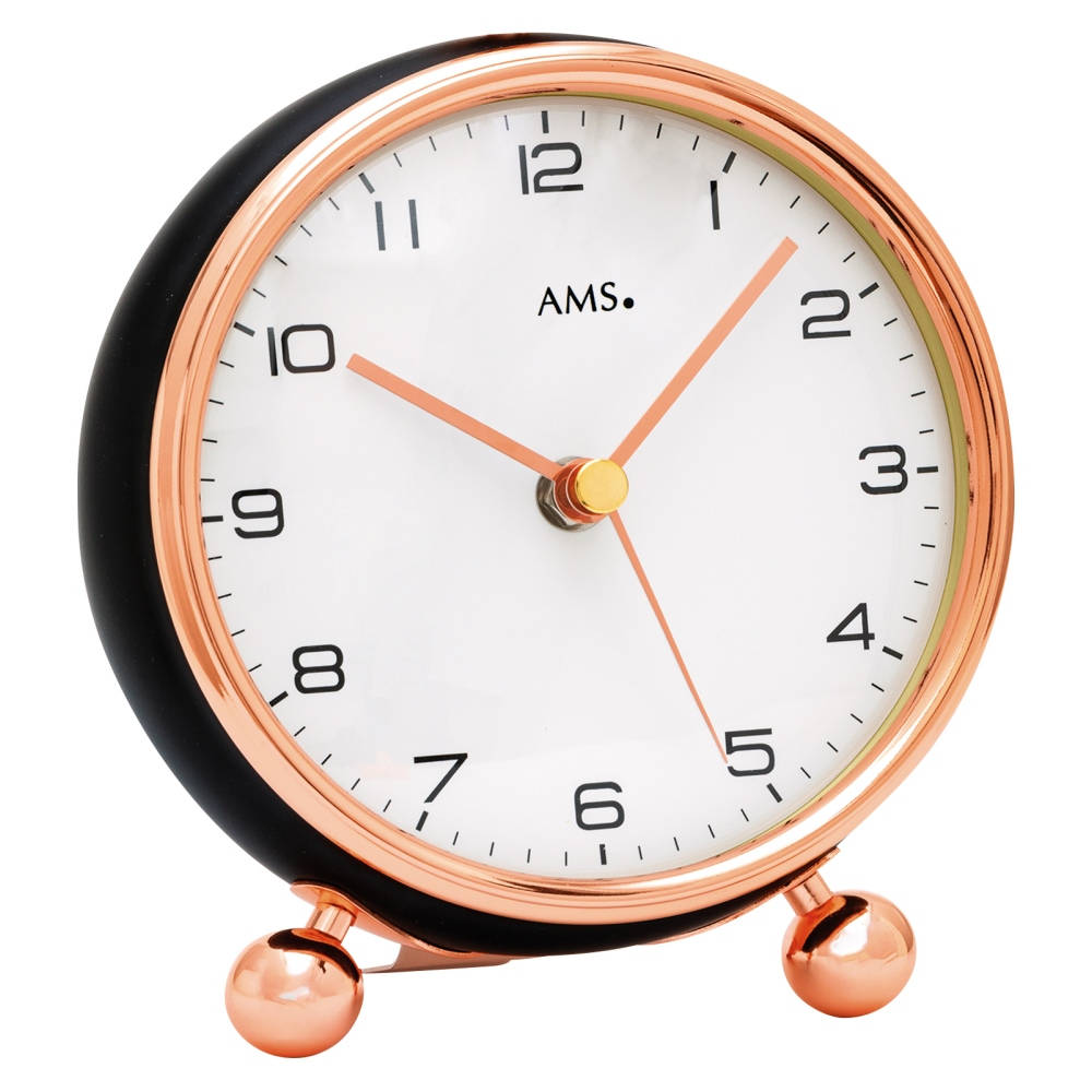 • Klok 5195 is een tafelklok van koperkleurig metaal met een zwarte rand en gebold mineraalglas.