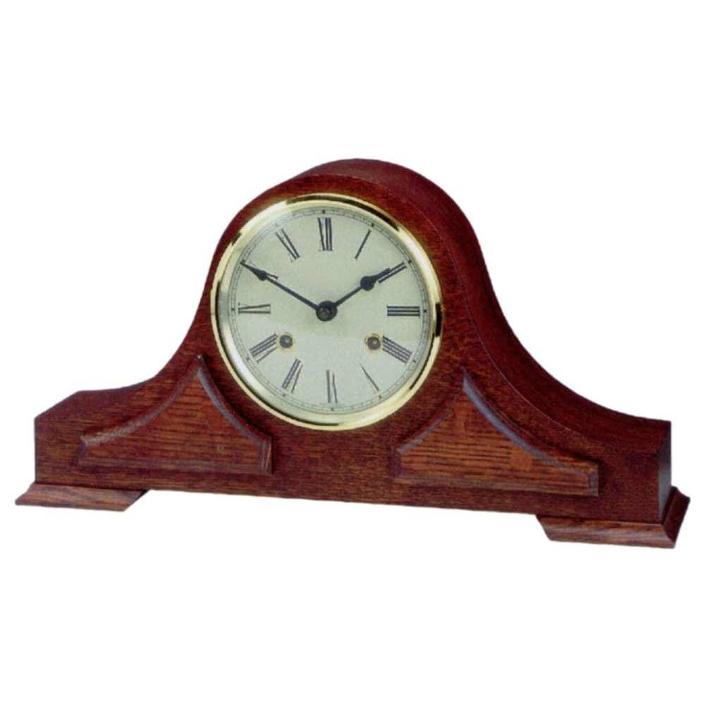 • Klok 120-290 is een donker eikenhouten tafelklok met opgelegde ornamenten, messing gekleurde rand en een gebold mineraalglas voor de wijzerplaat.