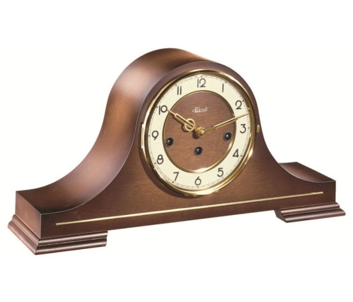 • Klok 21092-030150 is een tafelklok met een noten gekleurde houten kast met een messing strip en rand rond het gebolde mineraalglas voor de wijzerplaat.