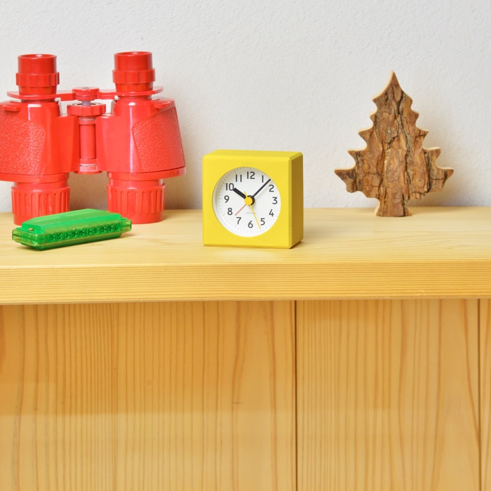 • Klok PA18-02YE is een kleine houten tafelklok met wekfunctie in een geel gelakte uitvoering.