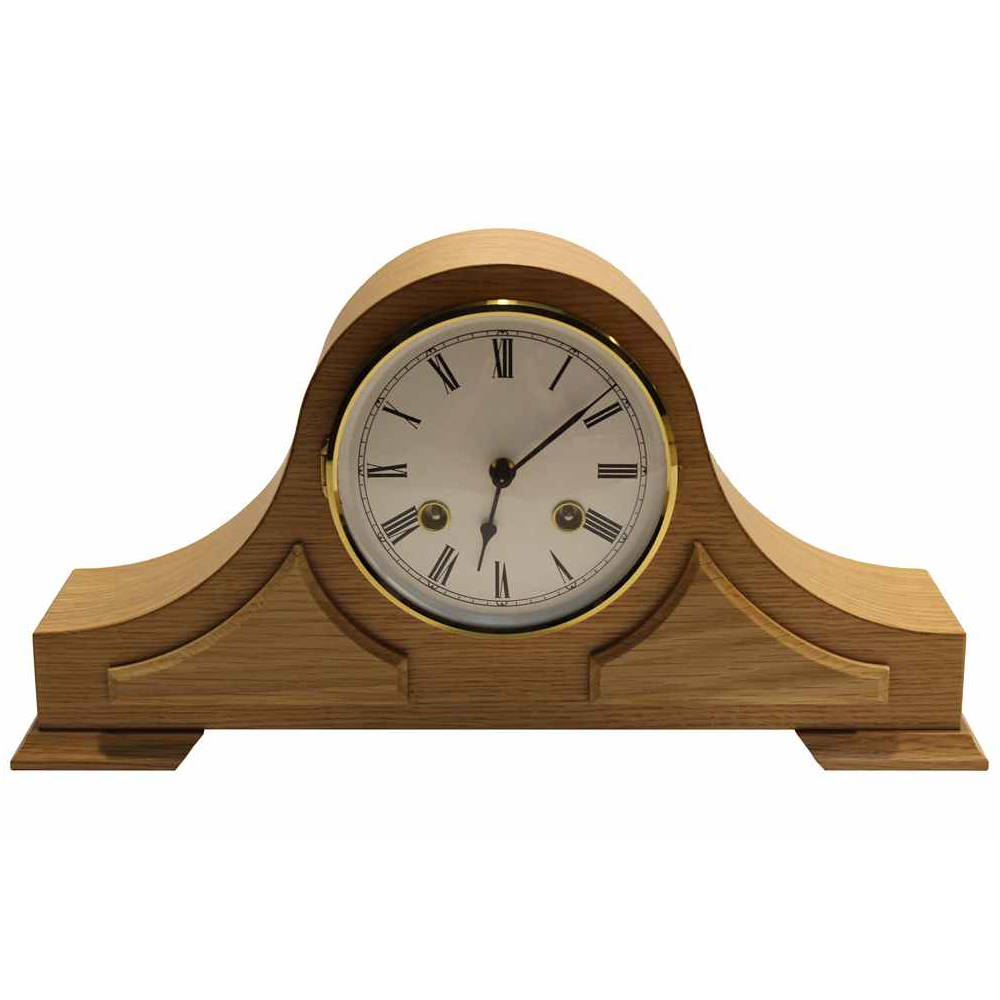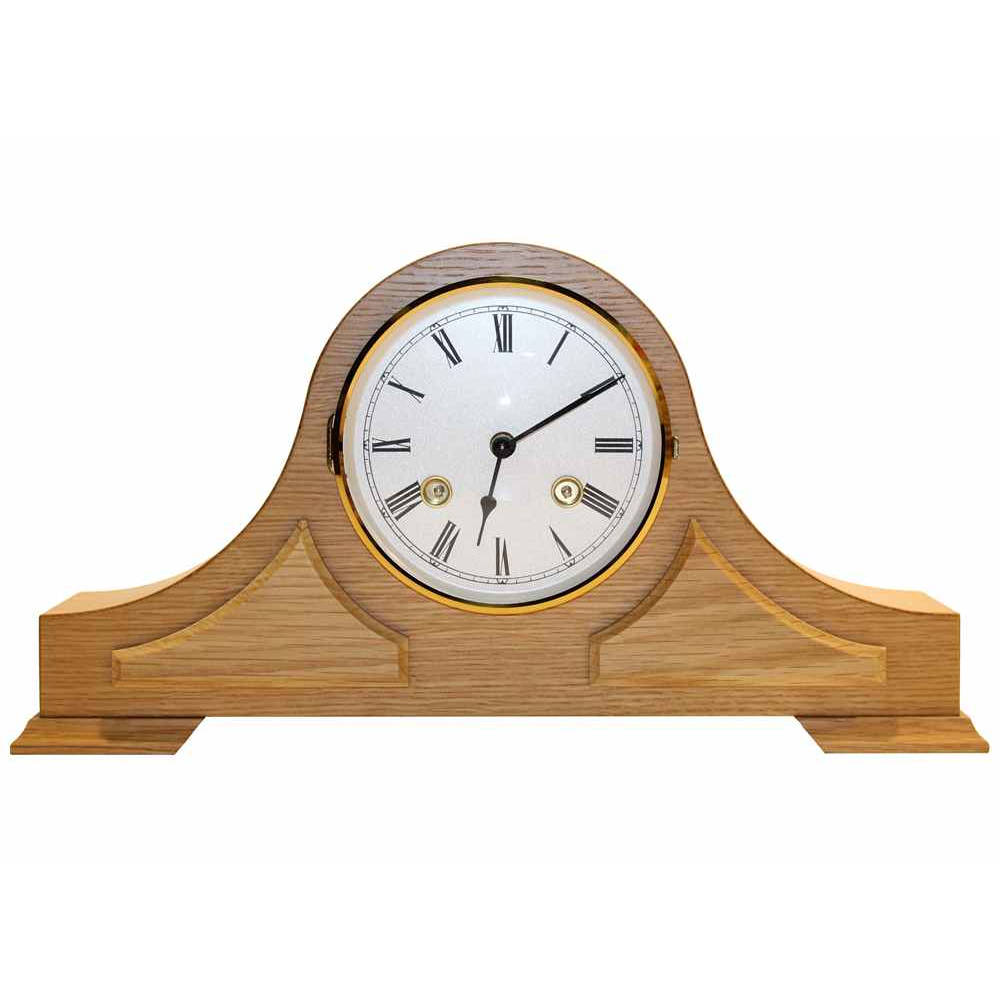 • Klok 120-300 is een licht eikenhouten tafelklok met opgelegde ornamenten, messing gekleurde rand en een gebold mineraalglas voor de wijzerplaat.