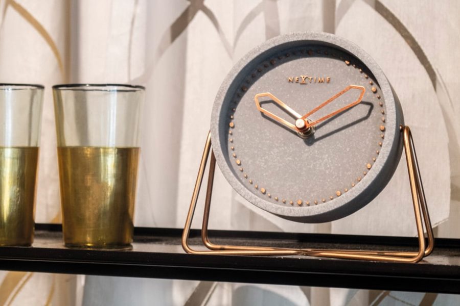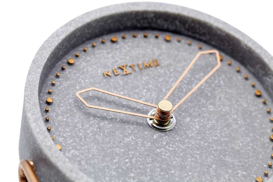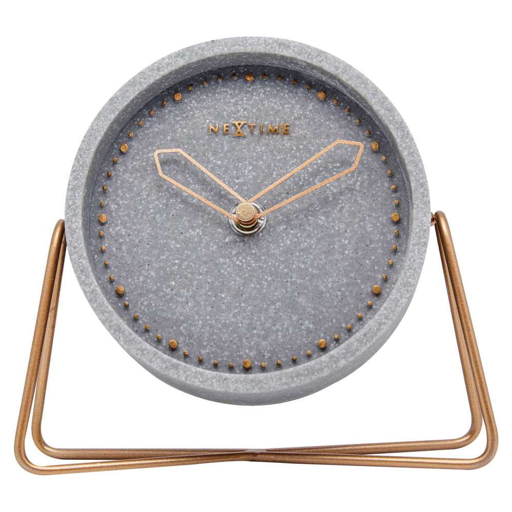 • Klok NE5204GS is een tafelklok in een grijs gekleurde betonnen (polyresin) uitvoering met een rosé goudkleurig standaard, open metalen wijzers en verhoogde urenmarkeringen.