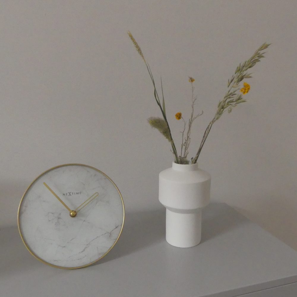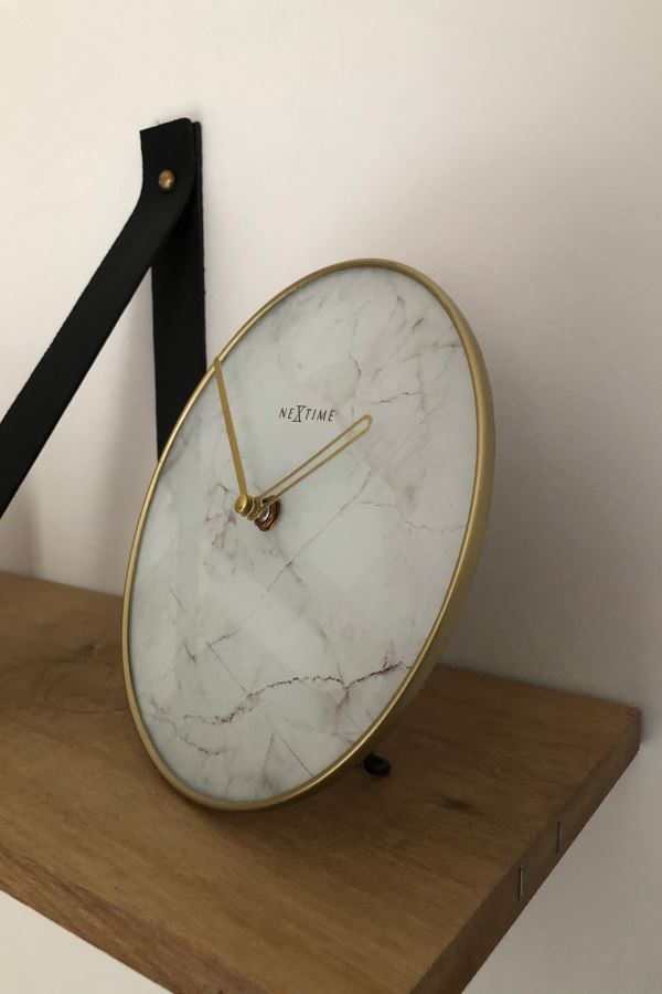 • Klok NE5222WI is een marmer stijl tafelklok gemaakt van glas en goudkleurig gematteerd metaal met een wit marmer motief wijzerplaat en goudkleurige metalen wijzers.