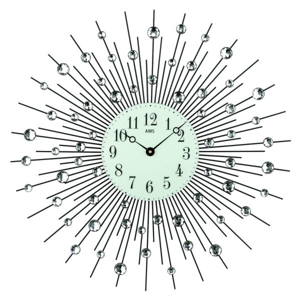 • Klok 9380 is een wandklok met zwart gelakte metaalstaven waarop geslepen glasstenen zijn gemaakt.