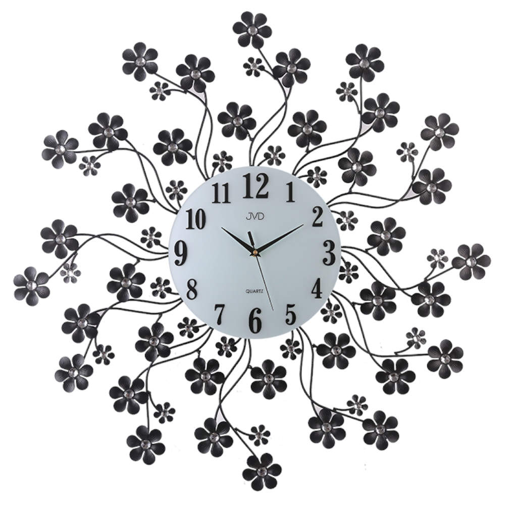• Klok HJ85J is een grote design wandklok van zwart gelakt metaal met een bloemen design en geslepen glasstenen.