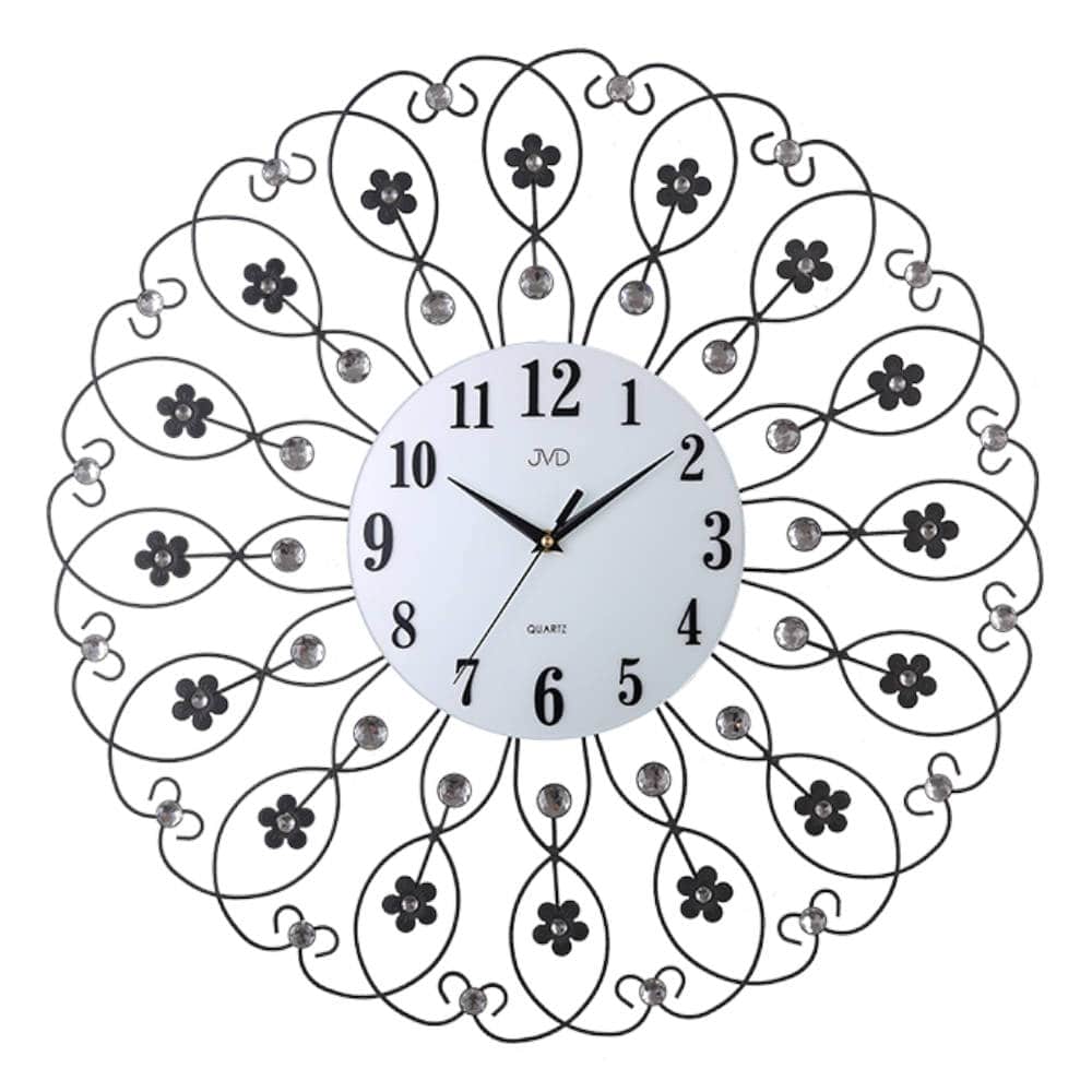 • Klok HJ86J is een grote design wandklok van zwart gelakt metaal met een bloemen design en geslepen glasstenen.