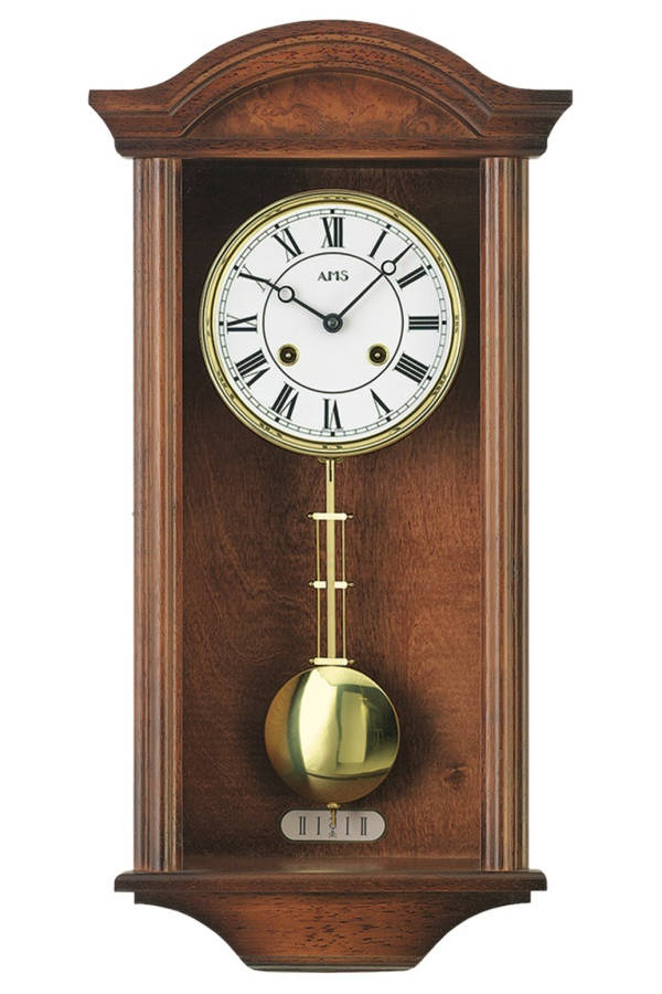 • Klok 2614-1 is een regulateur met een notenhouten kast, mineraalglas en een messing slinger en rand om de wijzerplaat.