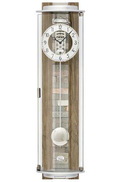 • Klok 2716 is een skelet wandklok van hout, ingelegd natuursteen en zilverkleurige houten boven- en onderkant.