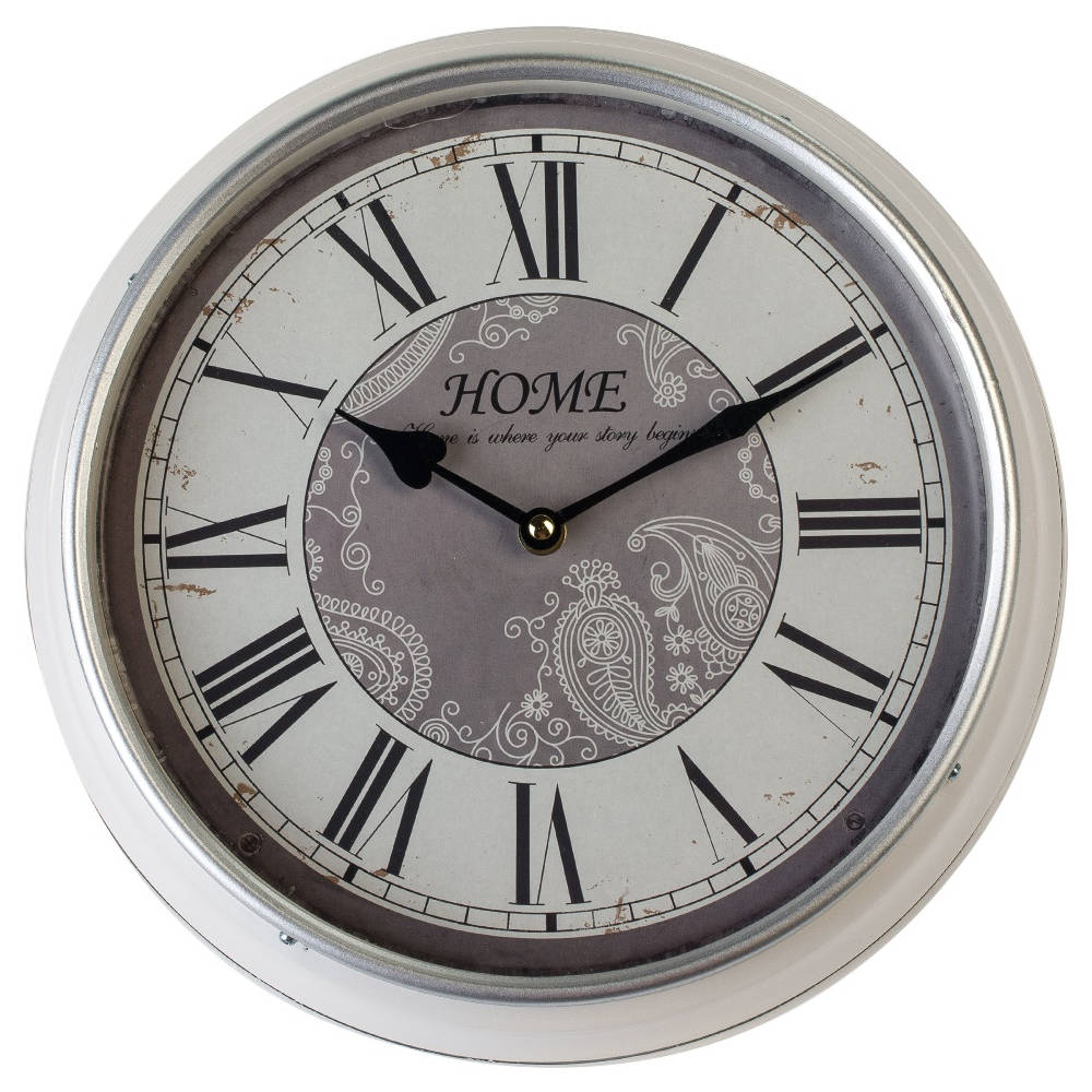 • Klok 1803676528 is een wandklok in een antiek stijl uitvoering met een wit-crèmekleurige metalen rand die is opgelegd met een zilverkleurige rand.