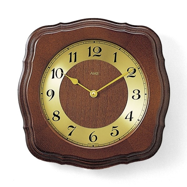 • Klok 5862-1 is een wandklok van massief hout in een notenhouten kleur gelakt, de cijferrand en wijzers zijn messing gekleurd, voor de wijzerplaat zit een mineraalglas.