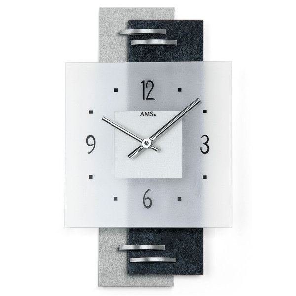 • Klok 9245 is een wandklok met een zilver gelakte achterwand en leisteen motief waarop aluminium delen zijn gemaakt, de wijzerplaat is van gematteerd mineraalglas.