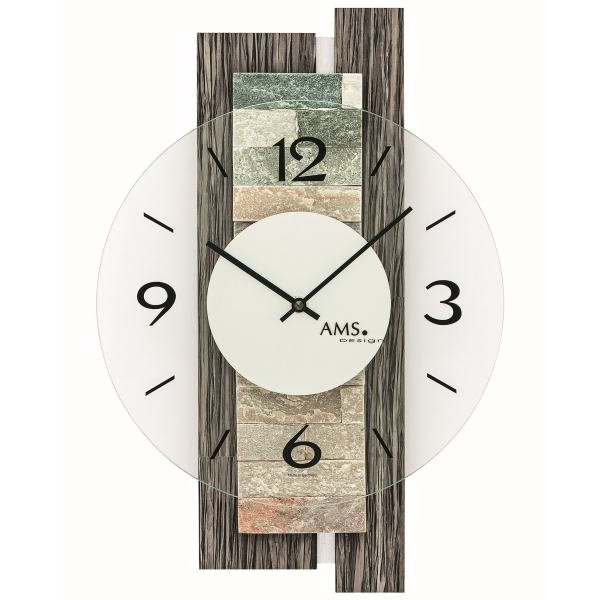 • Klok 9544 is een wandklok met een houten achterwand waarop een zwart-grijs hout motief, natuurstenen en gematteerd aluminium zijn opgelegd.