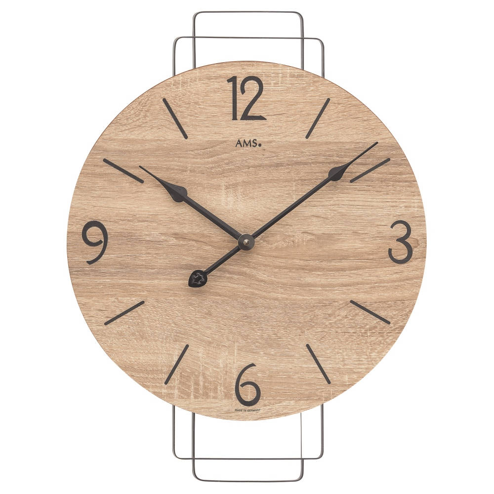 • Klok 9687 is een wandklok met een achterwand van gebogen antracietkleurige metaalstaven en een sonoma eikenhouten motief wijzerplaat met zwarte opgedrukte cijfers.