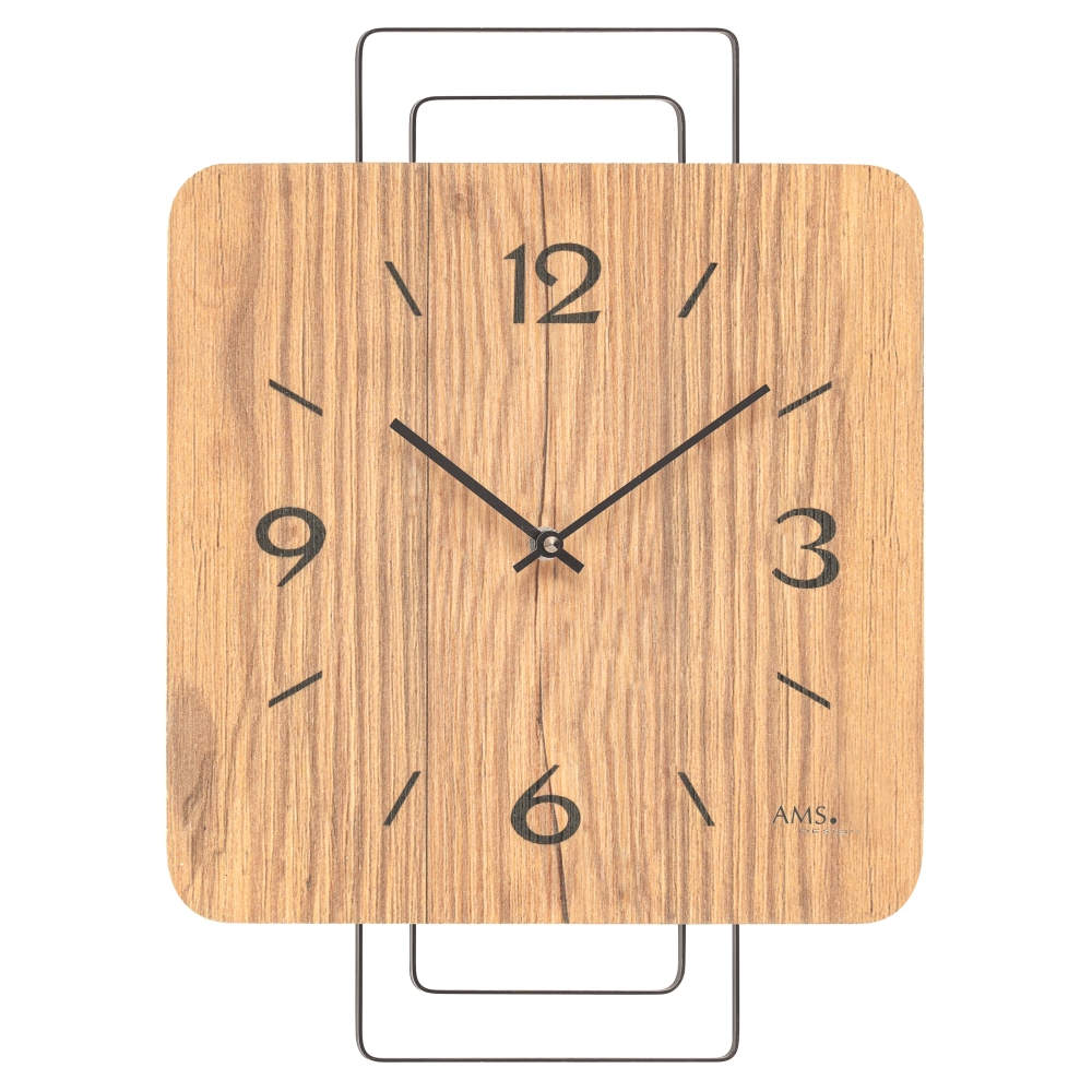• Klok 9700 is een wandklok met een achterwand van gebogen zwarte metaalstaven en een wild eikenhouten motief wijzerplaat met zwarte opgedrukte cijfers.