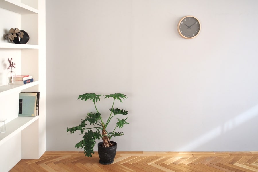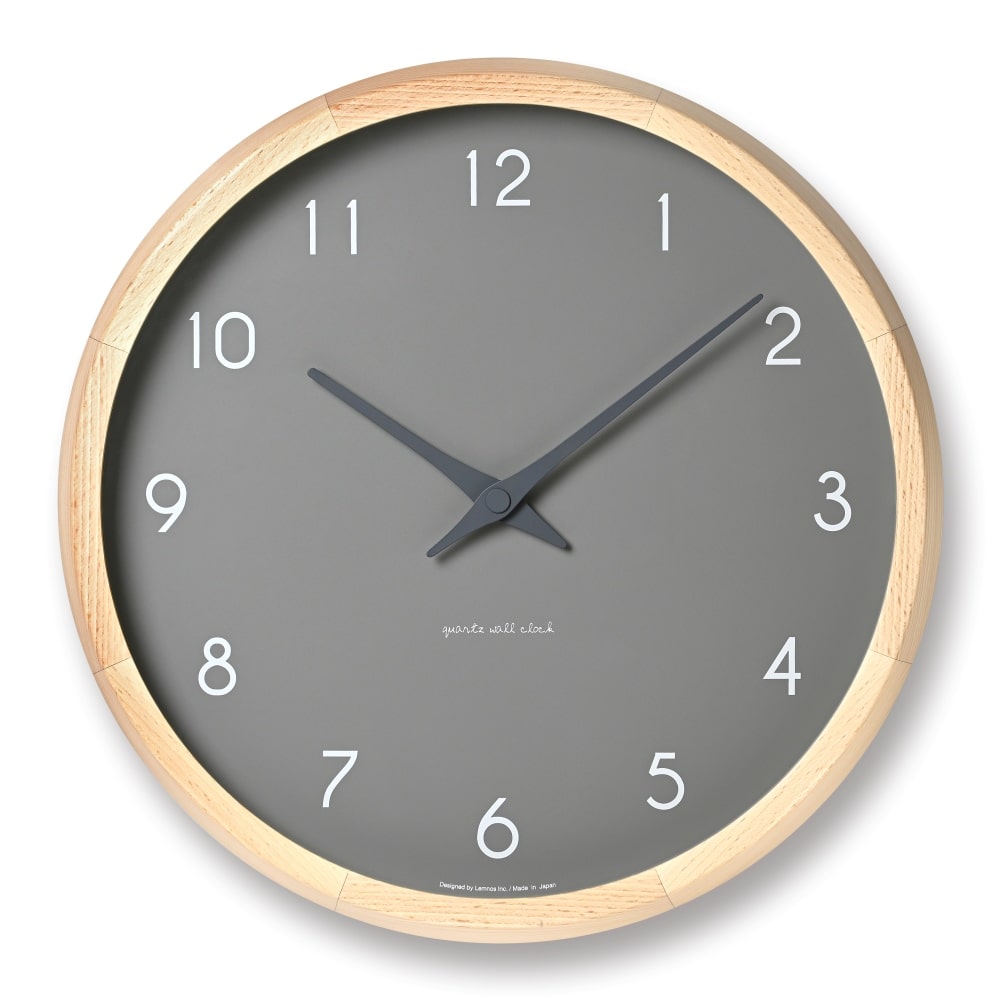 • Klok PC24-03GY is een design wandklok met een beukenhouten rand en een matte grijze wijzerplaat met witte opgedrukte cijfers.