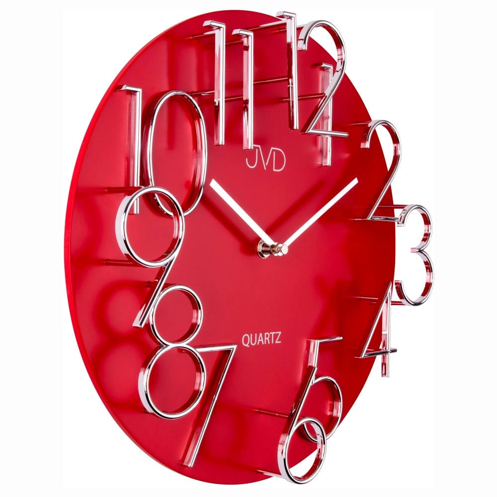 • Klok HB10J is een wandklok van mat rood gelakt hout met glanzende zilverkleurige cijfers en glanzende metalen wijzers.