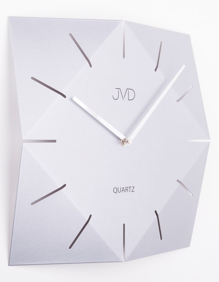 • Klok HB21-2J is een wandklok in een matte witte metalen uitvoering met gebogen hoeken, uitgefreesde sleuven en zilverkleurige wijzers.