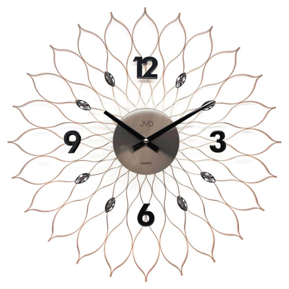 • Klok HT115-2J is een design wandklok met een glanzend koperkleurig metalen bloemenmotief en geslepen glasstenen.
