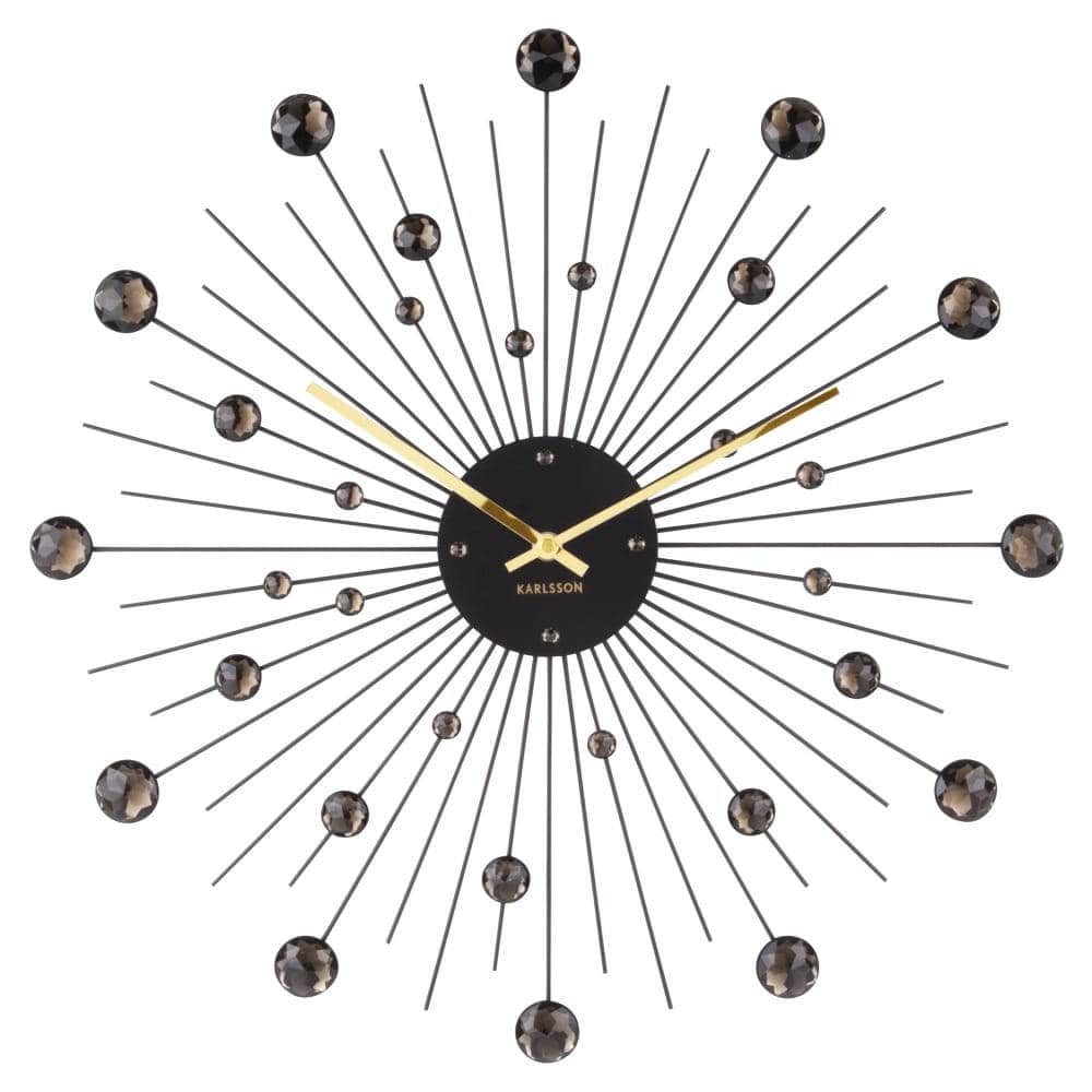 • Klok KA4859BK is een design wandklok met mat zwarte metaalstaven waarop geslepen zwarte glasstenen zijn gemaakt.