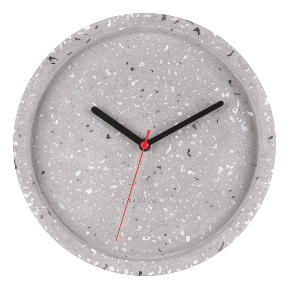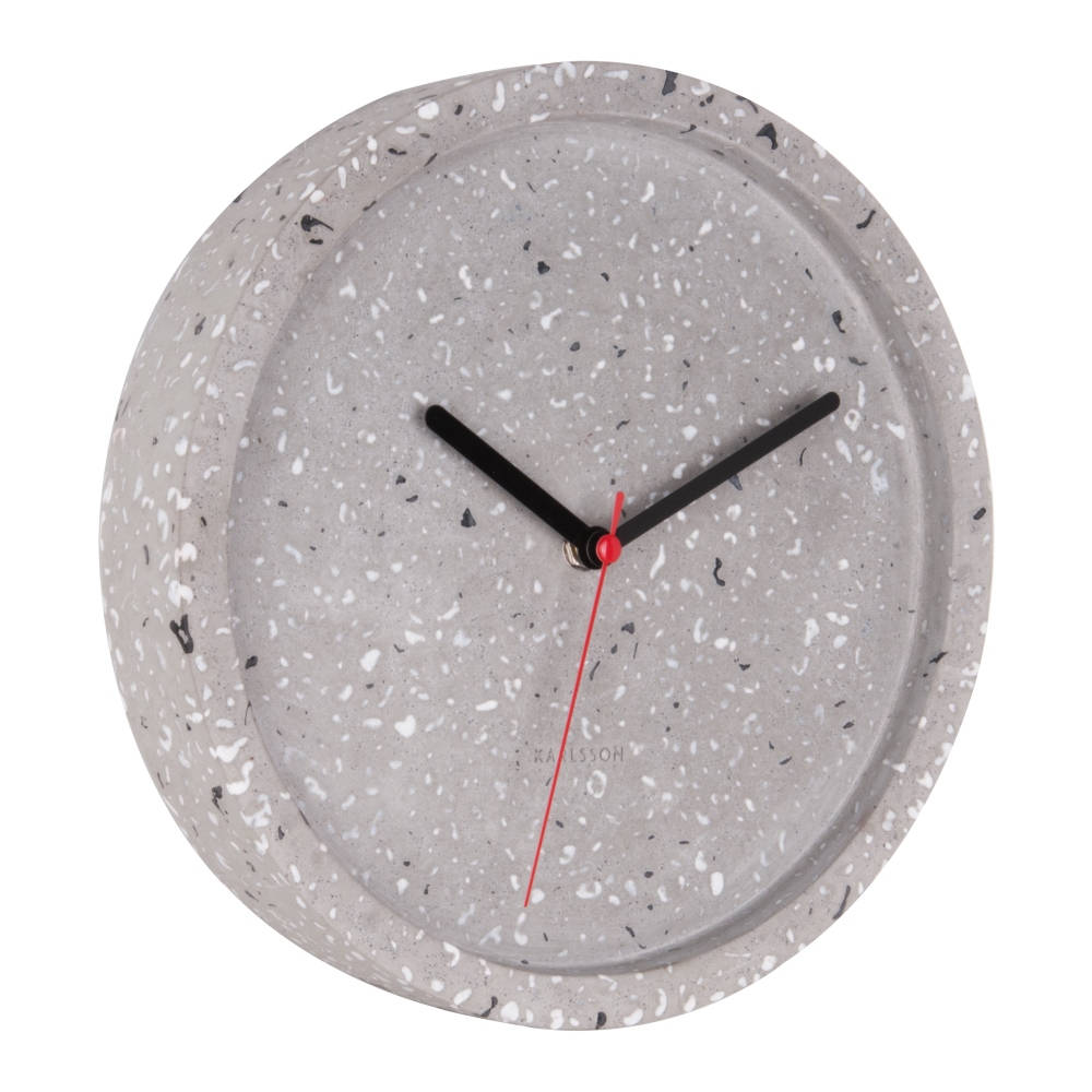 • Klok KA5746 is een wandklok in een terrazzo grijze uitvoering van beton met zwarte wijzers en rode secondewijzer.