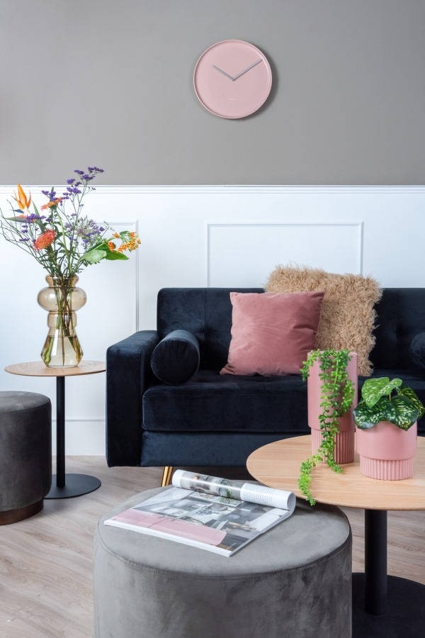• Klok KA5786PI is een wandklok in een matte roze porseleinen uitvoering met mat zilverkleurige metalen wijzers.