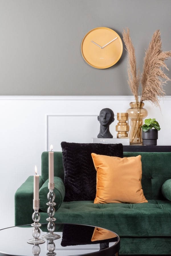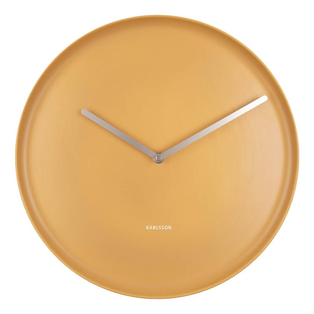 • Klok KA5786YE is een wandklok in een matte okergele porseleinen uitvoering met mat zilverkleurige metalen wijzers.