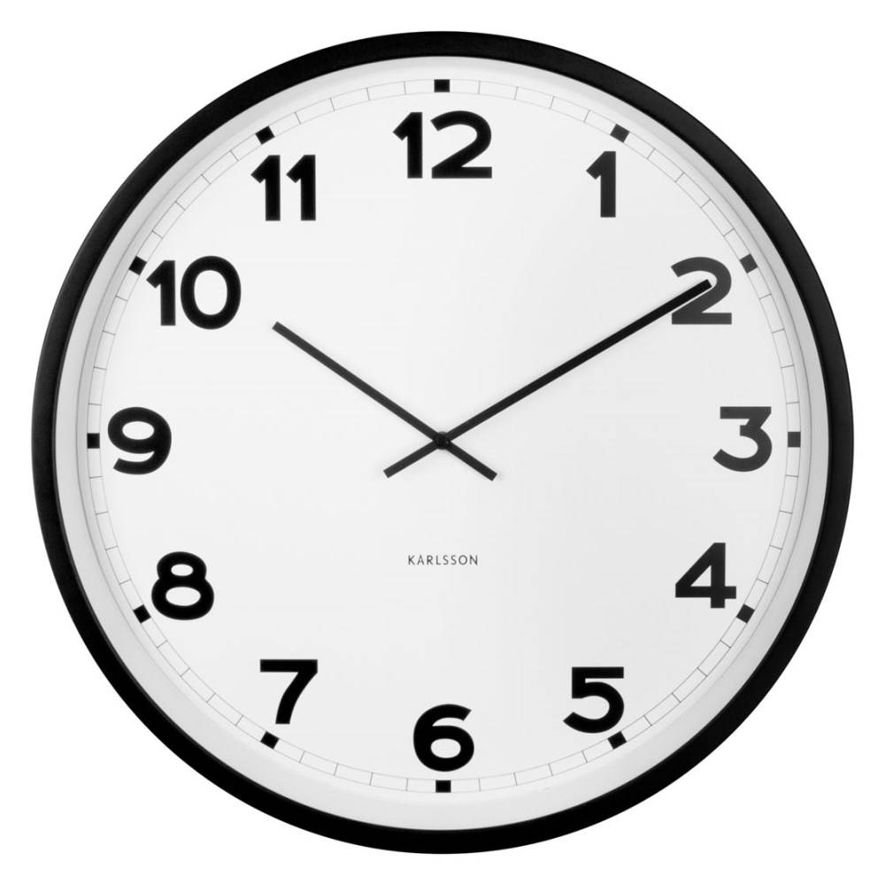 • Klok KA5848WH is een grote wandklok met een mat zwart gelakte metalen rand, zwarte metalen wijzers en een mineraalglas voor de witte wijzerplaat.