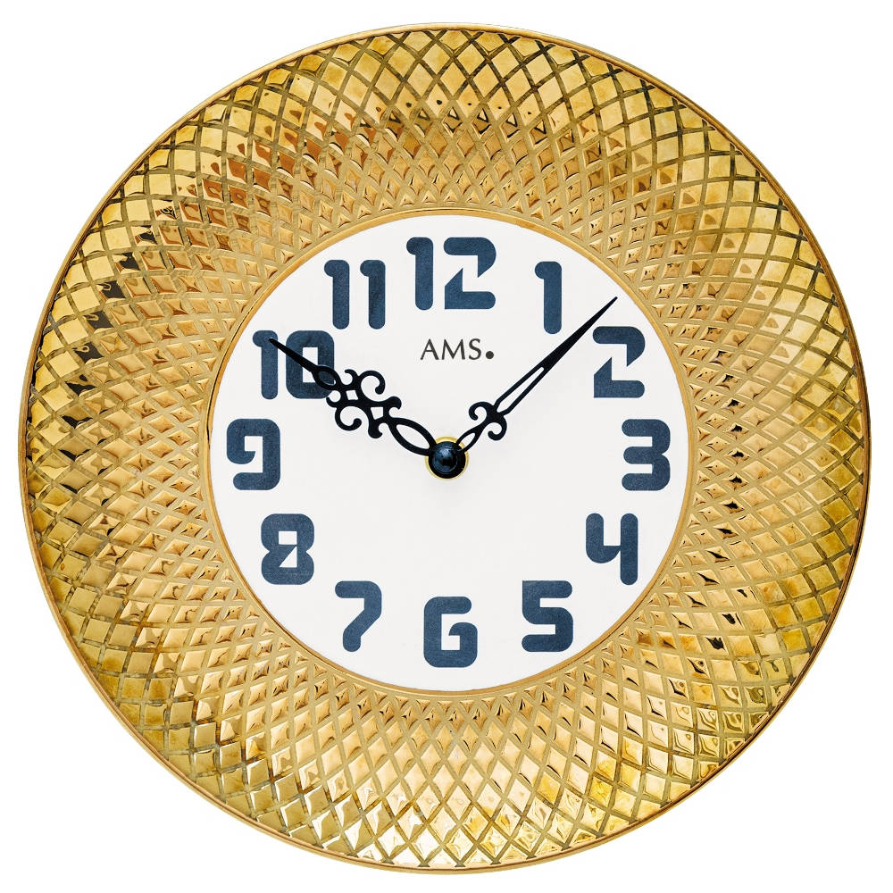 • Klok 9615 is een wandklok in een goudkleurige keramiek uitvoering met een witte wijzerplaat en zwarte metalen wijzers.