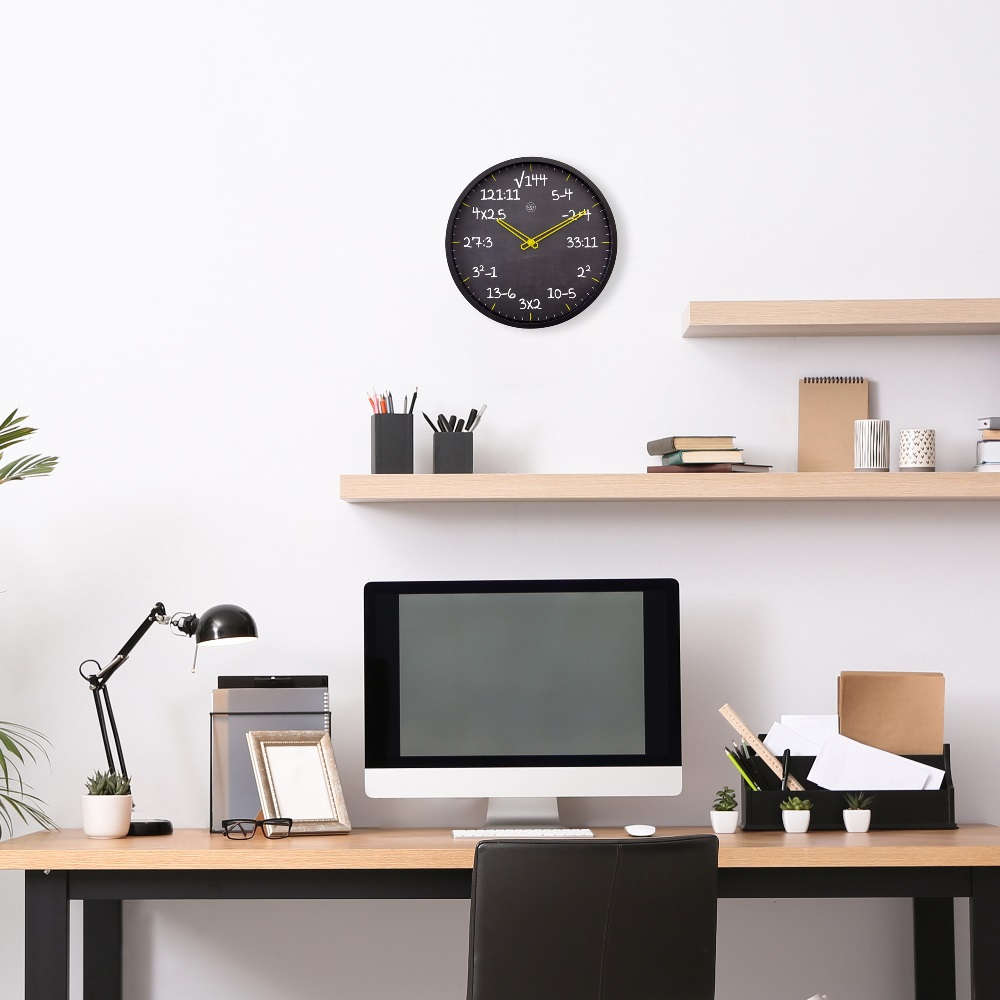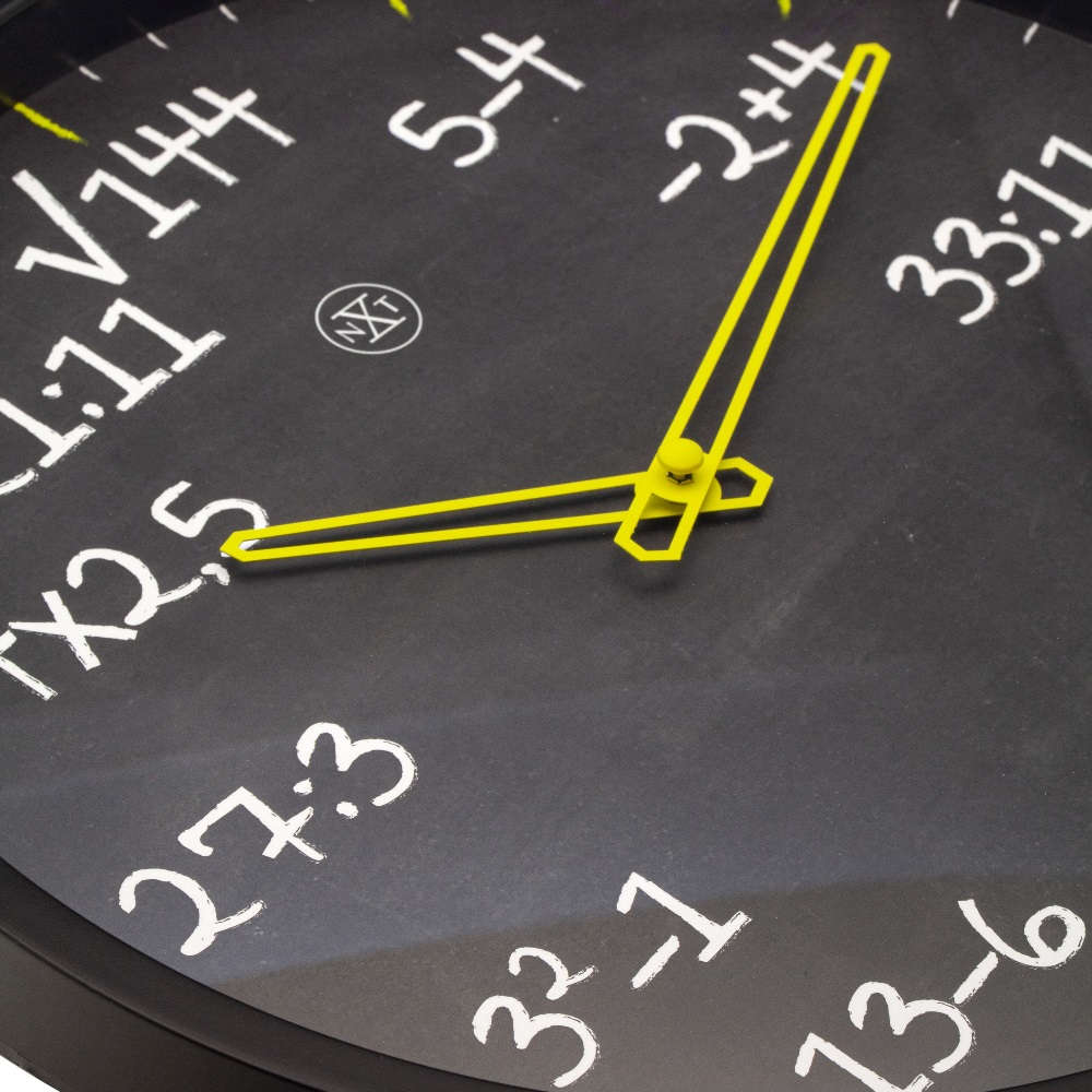 • Klok NX7363ZW is een wandklok met een mat zwarte kunststof rand en een zwarte wijzerplaat opgedrukt met rekensommen als urenweergave.