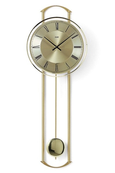 • Klok 7083 is een wandklok met messing gekleurde metaalstaven, wijzerplaat en slinger.