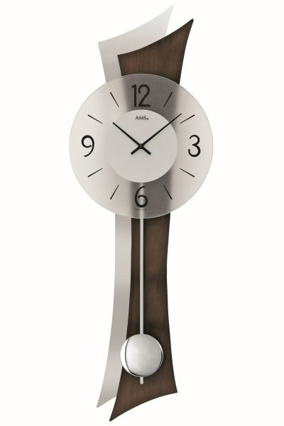 • Klok 7425-1 is een wandklok met een gebogen achterwand van noten gelakt hout en gematteerd aluminium, de wijzerplaat is van gematteerd mineraalglas.