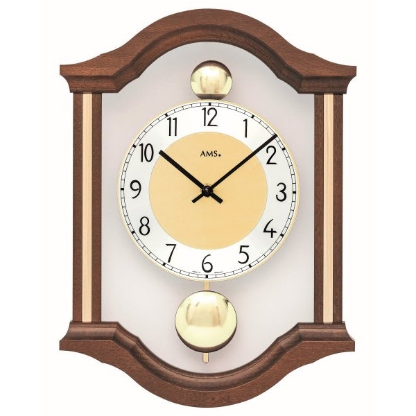 • Klok 7447-1 is een wandklok van massief noten gelakt hout met messingkleurige sierdelen, mineraalglas en een aluminium cijferrand.