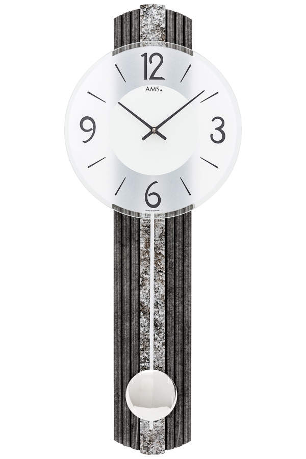 • Klok 7486 is een wandklok met een achterwand van antraciet gekleurd hout opgelegd met een metallic design motief.