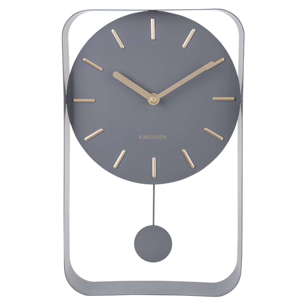 • Klok KA5796GY is een wandklok in een mat grijze stalen uitvoering met opgelegde matte goudkleurige urenmarkeringen en matte goudkleurige wijzers.